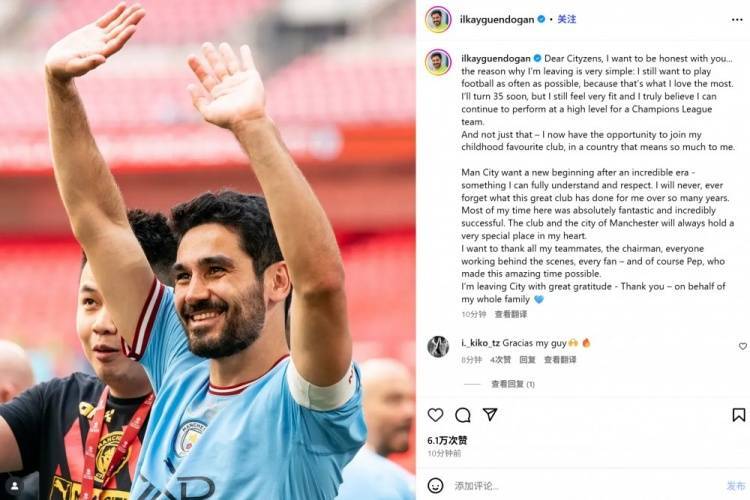 直播吧9月3日讯 34岁的德国中场京多安已经官宣加盟加拉塔萨雷,他也通过社媒发布了向曼城的告别信: